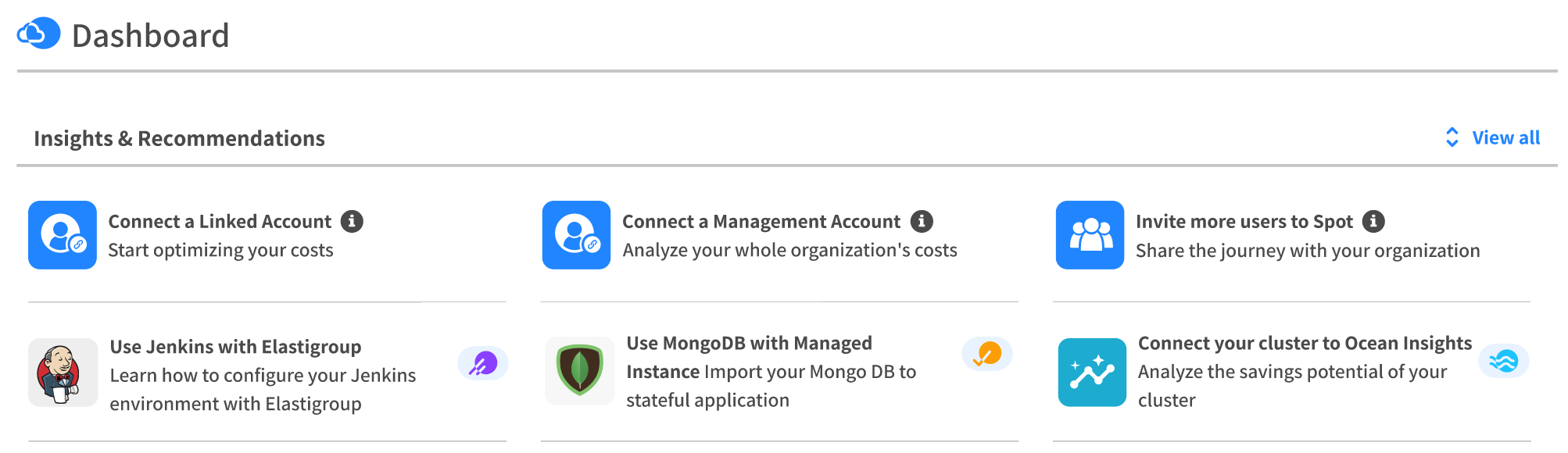 Go to Insights & Recommendations in the Dashboard. When you open the Spot console or when you have connected a cloud provider for the first time, this is the default view.